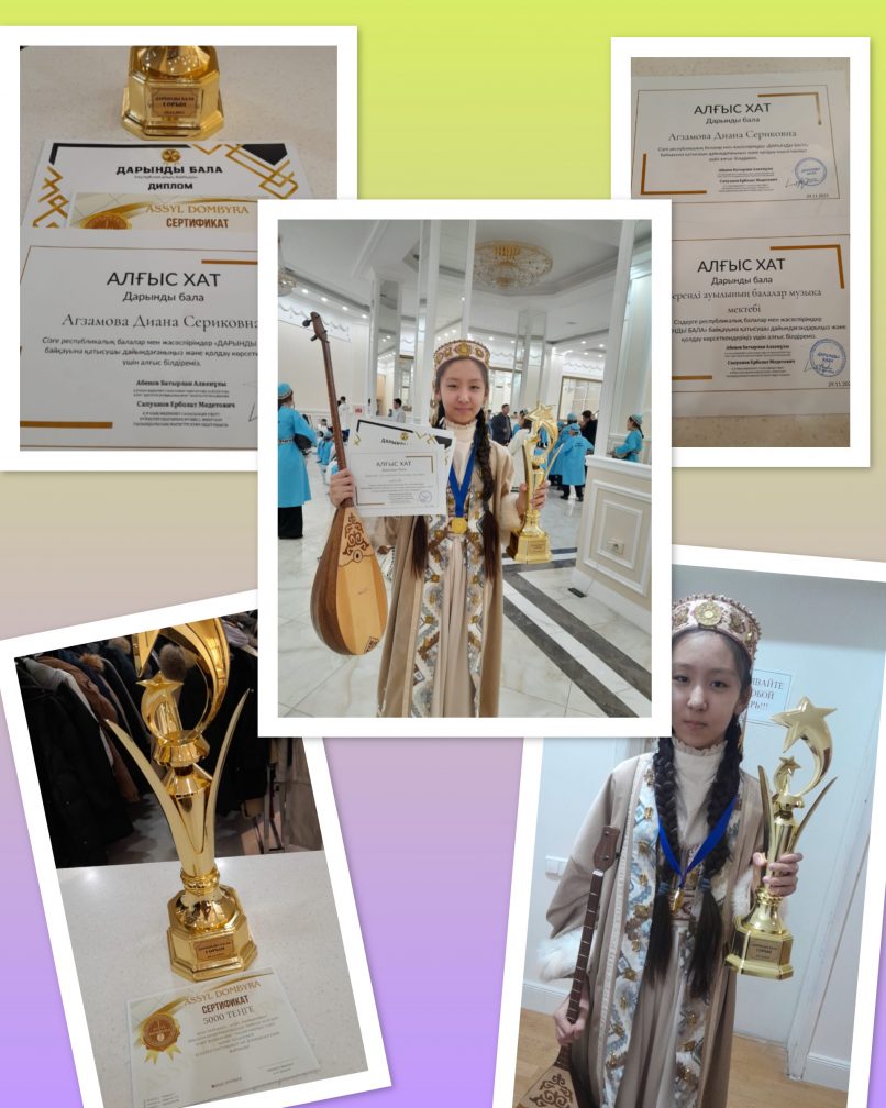 29.11.2025 «Дарынды бала» атты Республикалық байқауында домбыра номинациясы бойынша Шағалалы филиалының оқушысы Зейнелқабден Айым 1 орын иегері. Оқытушы: Агзамова Диана Сериковна.