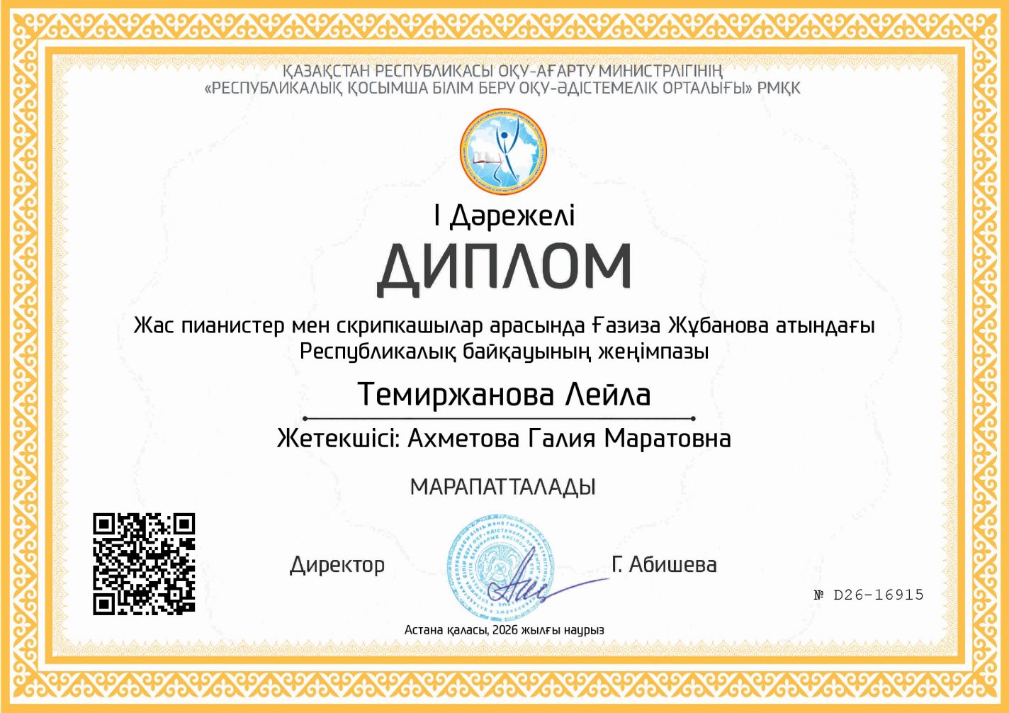 Зеренді балалар музыка мектебінің оқушысы Темиржанова Лейла Ғазиза Жұбанова атындағы жас пианистер мен скрипкашылар арасындағы республикалық байқауда 1 дәрежелі диплом иегері атанды. Оқытушысы: Ахметова Галия Маратовна.