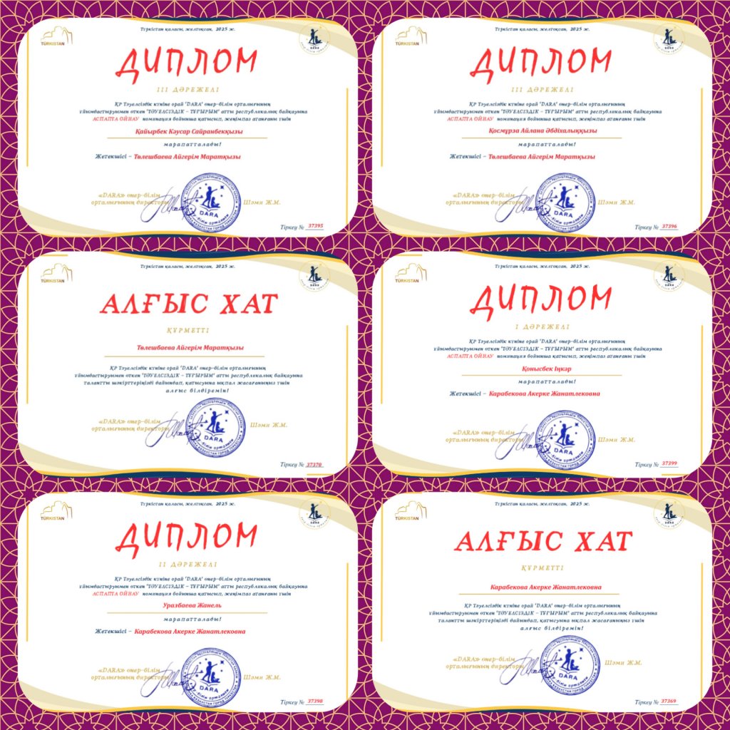 «Тәуелсіздік – тұғырым» атты республикалық байқауда «Аспапта ойнау» номинациясы бойынша балалар музыка мектебінің қобыз сыныбының оқушылары жүлделі орындарға ие болды . Қонысбек Інкәр — І орын, Уразбаева Жанель — ІІ орын, Қосмұрза Айлана — ІІІ орын, Қайырбек Кәусәр — ІІІ орын. Жас өнерпаздарымызды жеңістерімен құттықтаймыз! Шығармашылық табыс пен жаңа белестер тілейміз! Түркістан қаласы-2025.